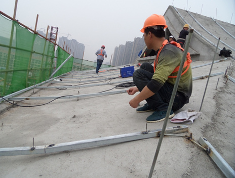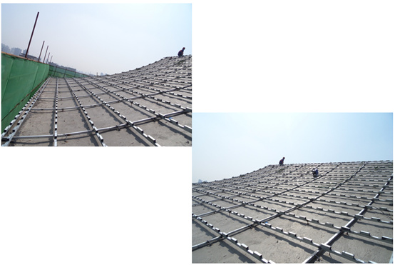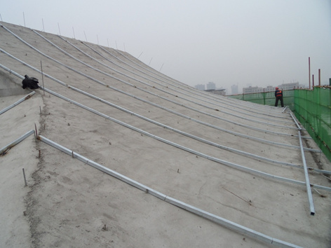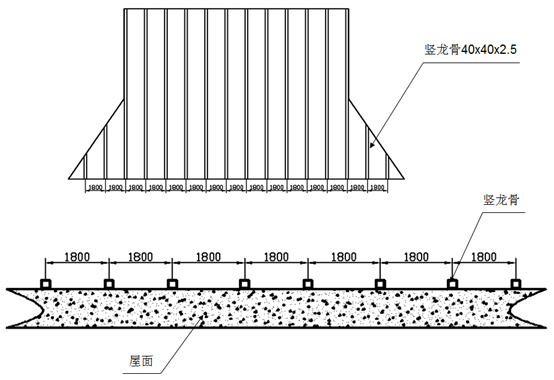 1、鋪設豎龍骨:根據屋面檐口尺寸,分中間距1800布置豎龍骨;