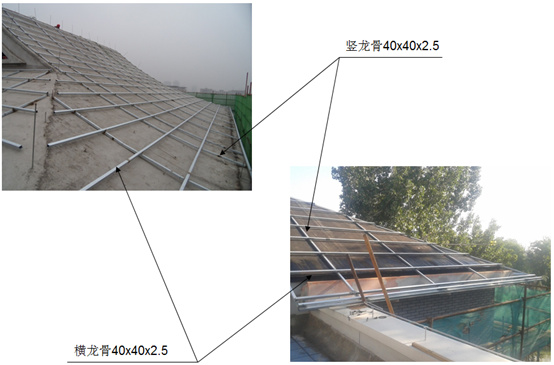 2、鋪設橫龍骨:根據檐口調直橫龍骨,與豎龍骨焊接牢固,橫龍骨鋪設尺寸依照下圖所示: