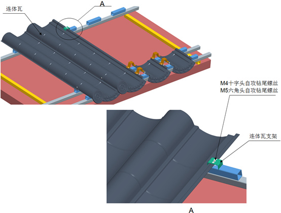 注:1、連體瓦與連體支架由M5鉆尾絲固定與次龍骨上;