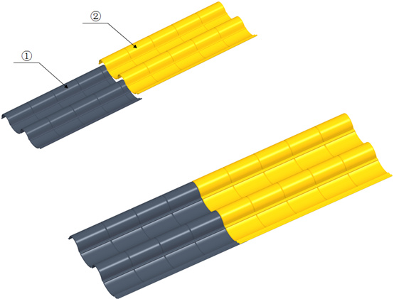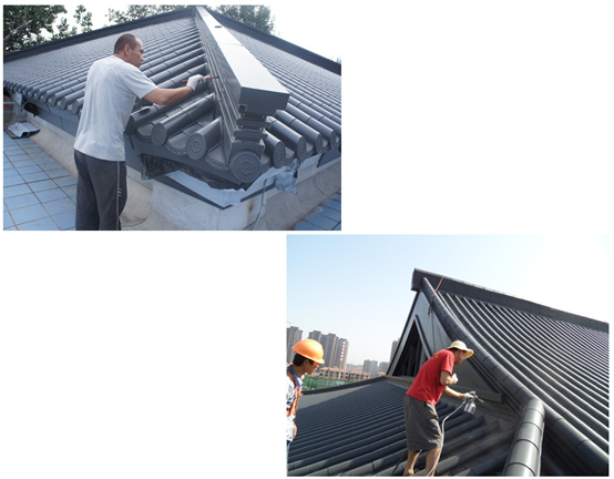 6、安裝瓦當筒瓦、金屬仿古連體瓦:安裝兩塊瓦當筒瓦后接著安裝一塊連體瓦,一次交替安裝: