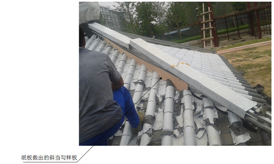 1、根據現場的安裝情況如圖所示先用紙板裁出斜當勾樣板,比對樣板與屋面瓦間隙控制在3mm以內;