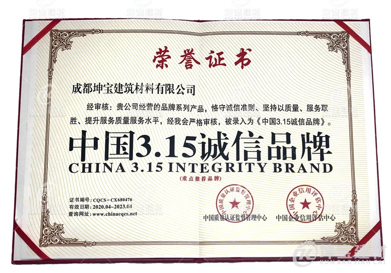 由中國(guó)質(zhì)量認(rèn)證監(jiān)督管理中心舉辦,通過(guò)對(duì)千余家企業(yè)的誠(chéng)信、質(zhì)量情況進(jìn)行明察暗訪, 并結(jié)合企業(yè)信用評(píng)估中心,由專家組嚴(yán)格審核后,坤寶樹(shù)脂瓦以優(yōu)異表現(xiàn)榮獲由中國(guó)質(zhì)量認(rèn)證監(jiān)督管理中心,中國(guó)企業(yè)信用評(píng)估中心頒發(fā)的“中國(guó)315誠(chéng)信品牌”,得到公會(huì)和業(yè)內(nèi)專家的一致認(rèn)可。坤寶樹(shù)脂瓦憑借可靠的企業(yè)信用,過(guò)硬的產(chǎn)品質(zhì)量,和優(yōu)質(zhì)的售后 服務(wù),順利通過(guò)考核,獲此殊榮。