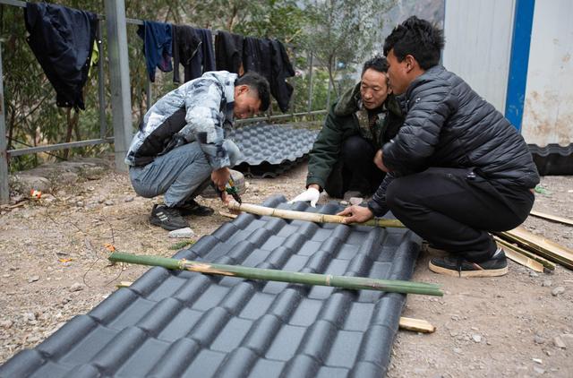 12月23日,某色蘇不惹(左)在捆綁固定合成樹脂瓦,準備通過鋼梯背到村里。