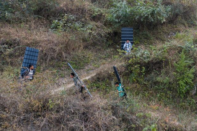 12月23日,某色蘇不惹(右一)和同伴背著修民宿的樹脂瓦往村里走(無人機照片)。