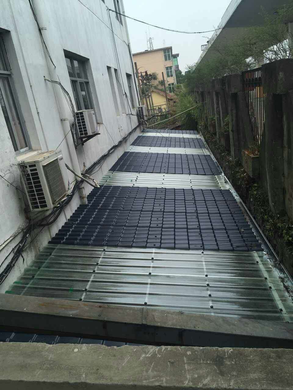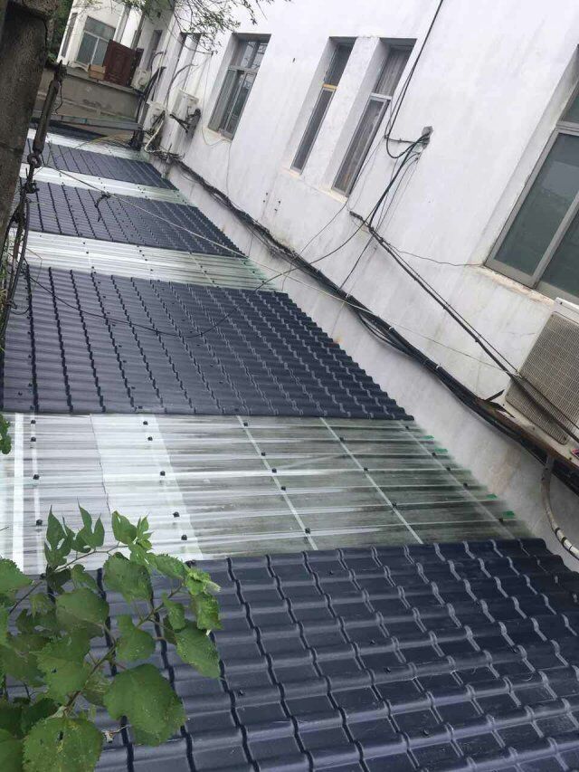 首先,樹脂瓦,釆用化學原料機械高溫壓制而成,主要原料是丙烯腈、苯乙烯、丙烯酸橡膠三種物質。重量輕,不到傳統瓦十分一,耐腐蝕,防水,防壓,防凍,防潮,雨停水不留,防冰雹,防地震,隔熱保溫,耐用,不褪色,保持屋面漂亮美觀,如果你使同正規廠家生產的樹脂瓦,它使用壽命可長達30年以上,永遠高于傳統的小青瓦,黃瓦了。現在我們常見的雨棚、遮陽棚等大多是用樹脂瓦蓋的。同時,樹脂瓦顏色鮮艷,這一點確實是顯而易見的。紅的、藍的、灰的等等,只要是你想要的房頂的顏色它都是能夠給你制造出來的。而且,干凈,用樹脂做的房頂自然是下雨天雨水沖洗的會比較干凈,所以樹脂瓦看上去比較潔凈。