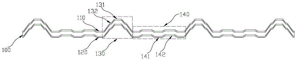 請參照圖1,本實用新型的t型塑鋼瓦與合成樹脂防腐瓦,包括:合成樹脂瓦本體100,合成樹脂瓦本體100呈中空設置。合成樹脂瓦本體100包括:從上向下設置的**瓦體110和第二瓦體120,**瓦體110和第二瓦體120分別設置有交替分布的隆起部130和平緩部140,**瓦體110的隆起部130與第二瓦體120的隆起部對應設置,**瓦體110的平緩部140與第二瓦體120的平緩部140對應設置。