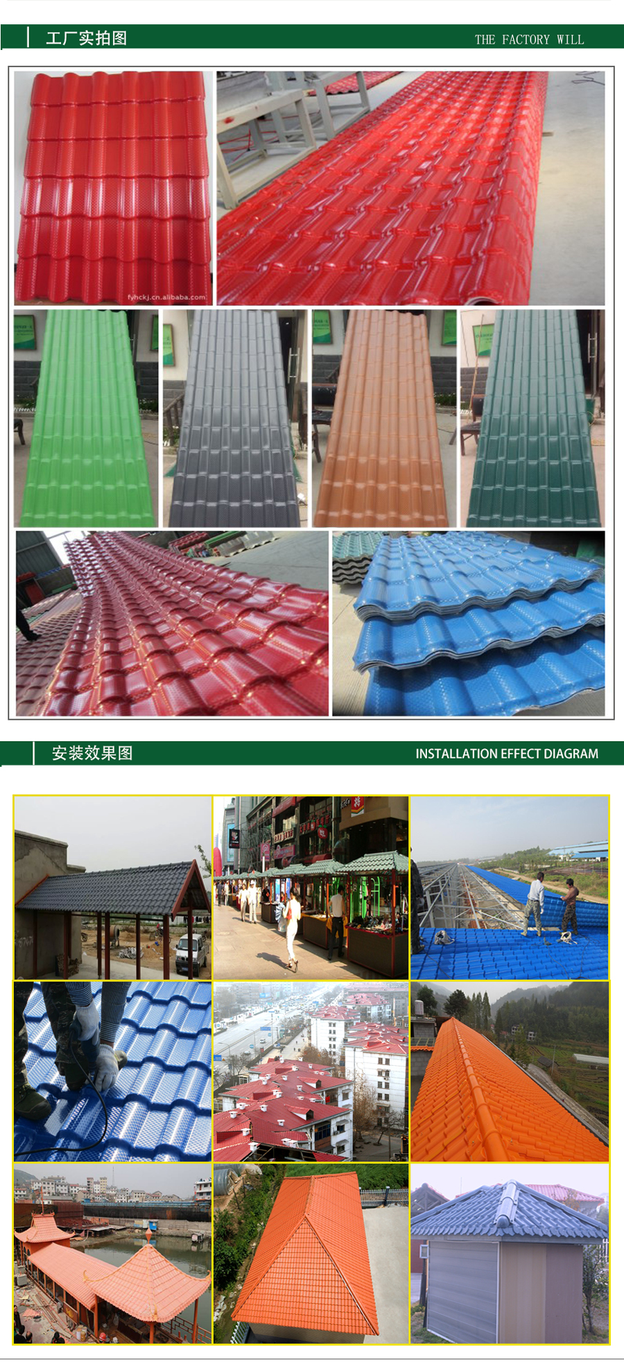 4,優異的耐腐蝕性能:不會被雨雪侵蝕,并可長期抵御酸、堿、鹽等各種化學物質的侵蝕。產品不會變形或變色,各種微生物也無法在瓦的表面生存。