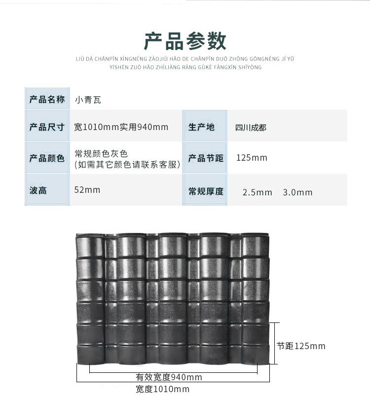 樹脂小青瓦,吸水率小于1%,具有強度高、密度高、抗凍、耐急冷急熱、耐腐蝕、不生青苔,不會褪色,使用壽命,可以在任何惡劣環境下使用。在高層次的唐式建筑屋面應用廣泛。是古建筑修繕、古典建筑和現代建筑的上等建筑材料 。