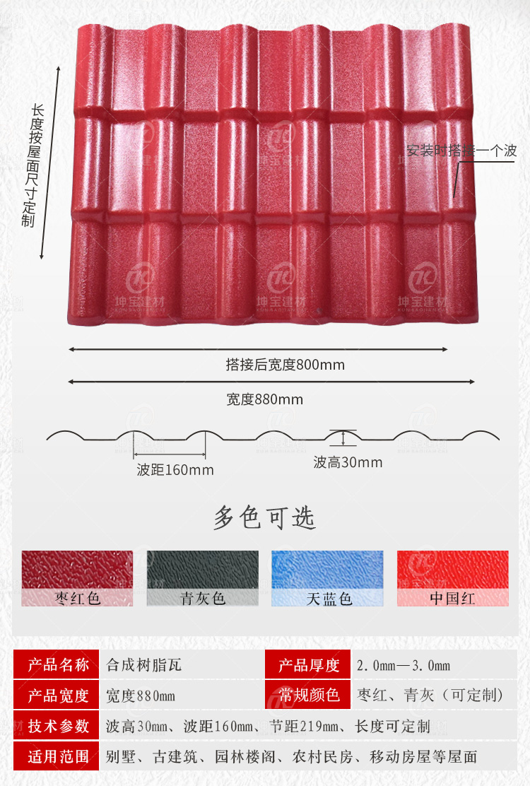 坤寶合成樹脂瓦采用高耐候ASA樹脂、韌性骨架層和高強度PVC耐磨層三層共技壓制而成,特點是色彩豐富并經久不褪,造型美觀立體感強且符合中國建筑文化特色。同時它還具有質輕、防水、堅韌、保溫、隔音、防腐蝕、抗風防震、抗冰雹、抗污染、防火、絕緣、安裝簡便等優點,是各類建筑表面裝飾和防水的理想材料,尤其適用于我國目前大力推廣的平改坡、新農村建設、新城鎮化、別墅屋面、民用建筑等屋面。